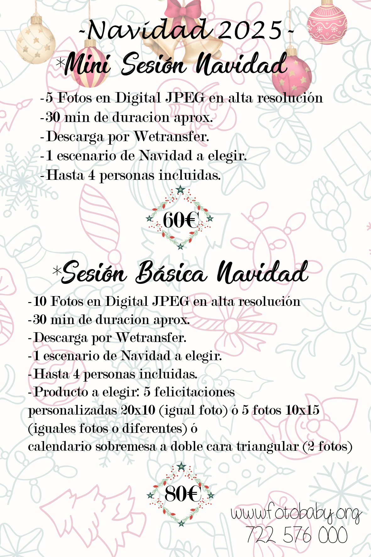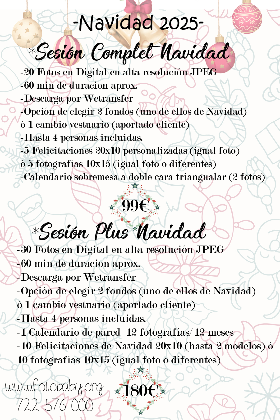 Como no podía ser de otro modo, también ofrecemos extras que podéis añadir al pack que os guste (fotografías impresas, felicitaciones de diferentes terminaciones, bolas de navidad, calendarios etc).